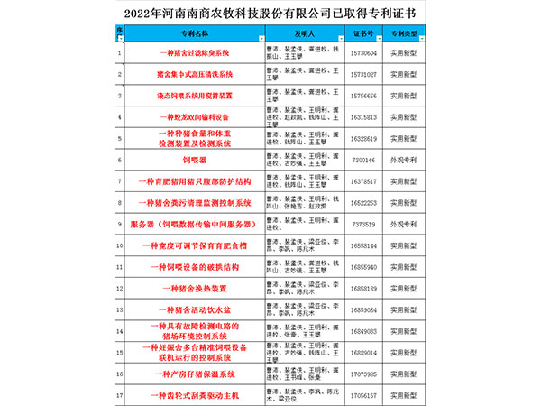 今年未完,南商農科就獲得了17項發明專利;從2009年到2022年,南商農科研發團隊已經取得了80余項國家專利,20余項軟著,歷經4代產品升級,先后研發了種豬測定站、小智倌妊娠、哺乳、保育育肥一體機等6大系列全套智能化養豬設備;?這些成就的取得是因為每一個南商人在平凡的崗位上踐行著不平凡的使命——做中國知名的智慧化豬場總包服務商。在以后南商人仍然會積極開展技術創新,用更多的發明專利、更加精良穩定的設備,為南商的客戶創造更多的收益,提供更大的價值。 路漫漫其修遠兮,吾將上下而求索,面對不斷變化的行情趨勢、日新月異的養殖需求,南商農科始終堅持誠信鑄就南商,科技創造價值的理念;獲得了“國家科學技術進步二等獎”、“神農中華農業科技獎”、“服務型制造示范企業”、“省級專精特新企業”、“小巨人”
