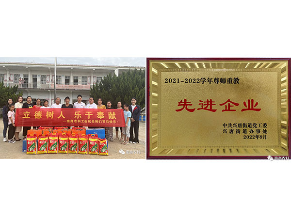 作為唐河縣產業集聚區的一份子,公司同樣關注產業集聚區教育發展和員工子女入學問題,用實際行動為地方教育事業作出積極貢獻,也因此被授予2021-2022學年的“尊師重教先進企業”。