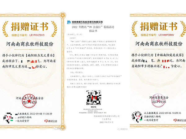 2013年,南商農科董事長曹沛先生積極響應家鄉號召,于南陽市唐河縣成立河南南商農牧科技股份有限公司。如今,南商農科依然不改初心,砥礪前行,以家鄉振興為己任,在今年的鄉村振興公益活動中,南商農科作為唐河縣慈善總會會員單位,積極助力唐河鄉村振興公益事業。