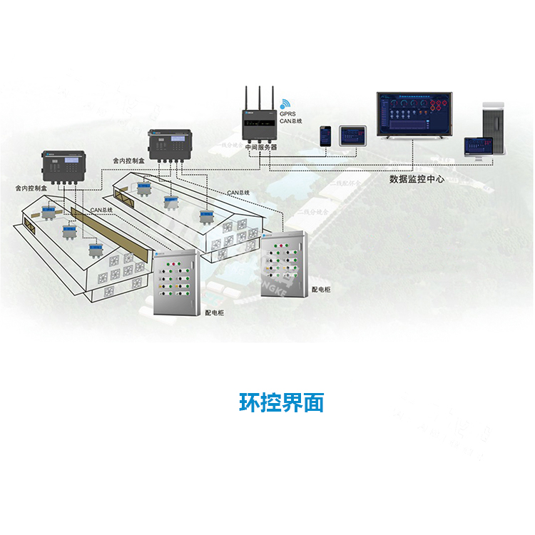 環境智能化監測控制系統,運用各種精密傳感器實現了舍中的溫度、濕度、氧氣、負氧離子、氨氣(NH3)濃度、二氧化碳(CO2)濃度、光照等物理量參數的監測。同時依靠GPRS網絡,把數據傳輸到遠程服務器,經過云運算處理后分類存儲到數據庫。管理員可以通過WEB系統、手機管理軟件連接服務器,遠程控制通風、換氣、及自動調控降溫等設備。系統廣泛應用于各大養殖場,實現了環境監測與控制一體化。