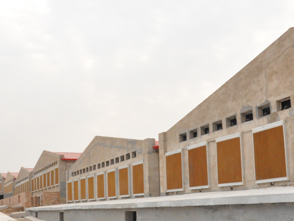 濕簾降溫系統是一種非常有效的密閉空間的降溫方法。到夏季就會開啟濕簾和風機,關閉其他通風孔和窗戶,形成密閉負壓的環境。濕簾降溫系統可以有效的降低夏季豬舍的溫度,減少豬群特別是種豬群的熱應激。