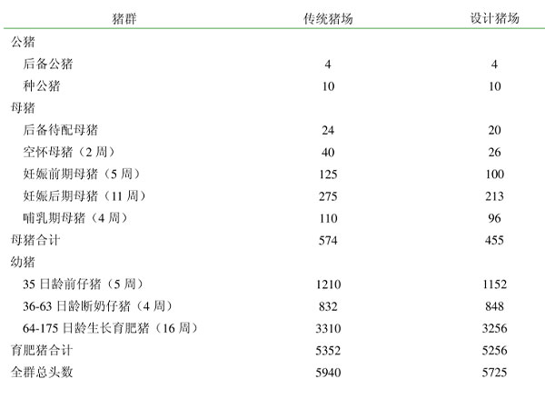 以上這是傳統(tǒng)的豬場(chǎng)設(shè)計(jì)標(biāo)準(zhǔn)所確定的各類豬群的日常存欄量,而若將大量的智能化設(shè)備運(yùn)用到現(xiàn)代化豬場(chǎng)中,將會(huì)導(dǎo)致具體各類豬群的日常存欄數(shù)與傳統(tǒng)的建設(shè)有所不同。其中由于傳統(tǒng)豬場(chǎng)與現(xiàn)代豬場(chǎng)中的年產(chǎn)仔窩數(shù)、窩產(chǎn)仔活數(shù)、仔豬存活率、保育期存活率、育肥期存活率均不同,那么傳統(tǒng)豬場(chǎng)與設(shè)計(jì)豬場(chǎng)的生產(chǎn)母豬數(shù)量并不相同。