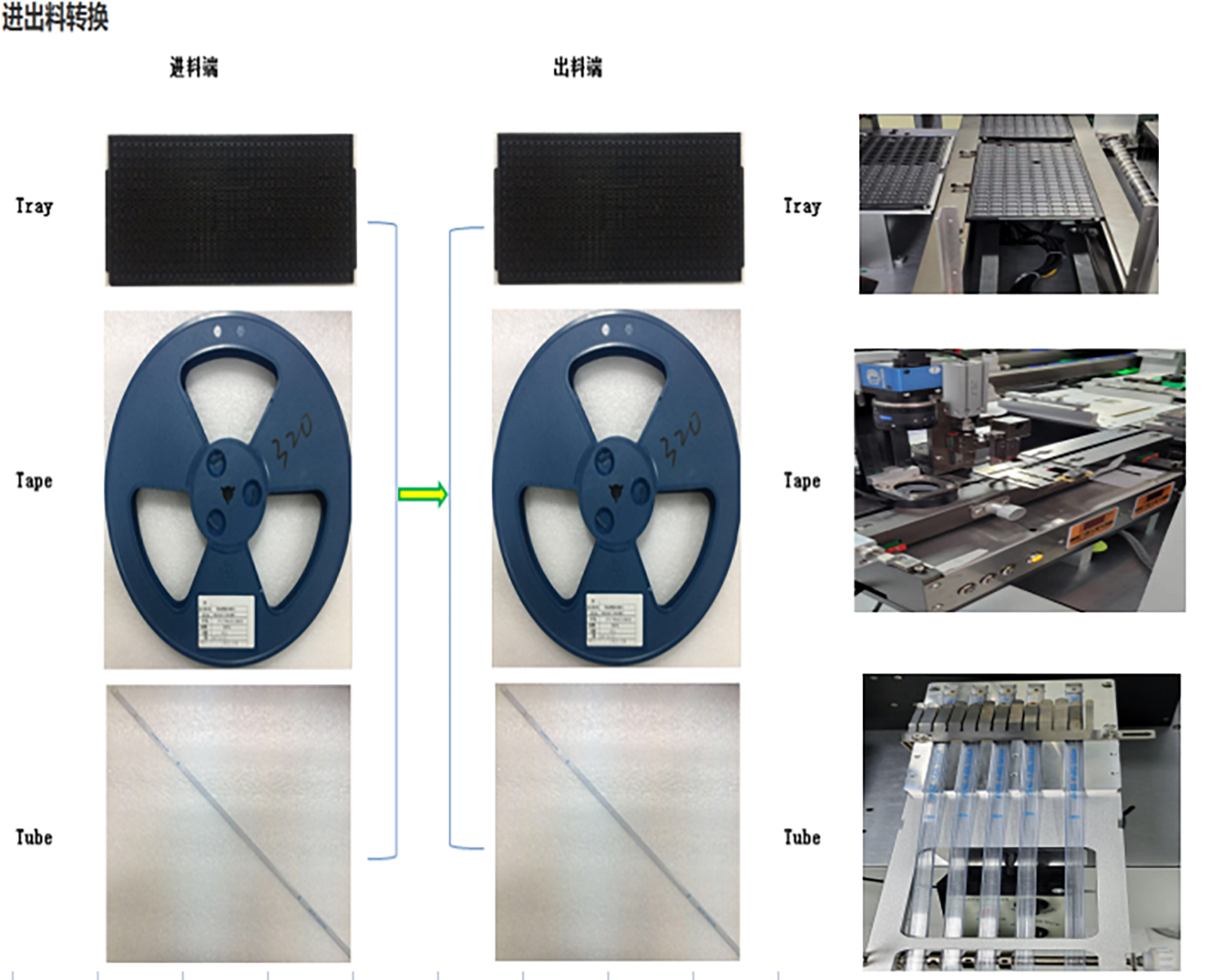 支持編帶/TRAY盤/管狀進出料方式,支持包裝轉換功能